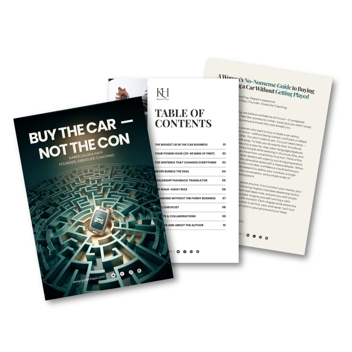"Buy the Car, Not the Con" is more than just a manual; it is a shield. This no-nonsense guide is designed specifically for women who are tired of being "played" by dealership tactics. Whether you are navigating a trade-in or securing financing, Karen provides the exact scripts and mindset shifts you need to stay in the driver's seat.